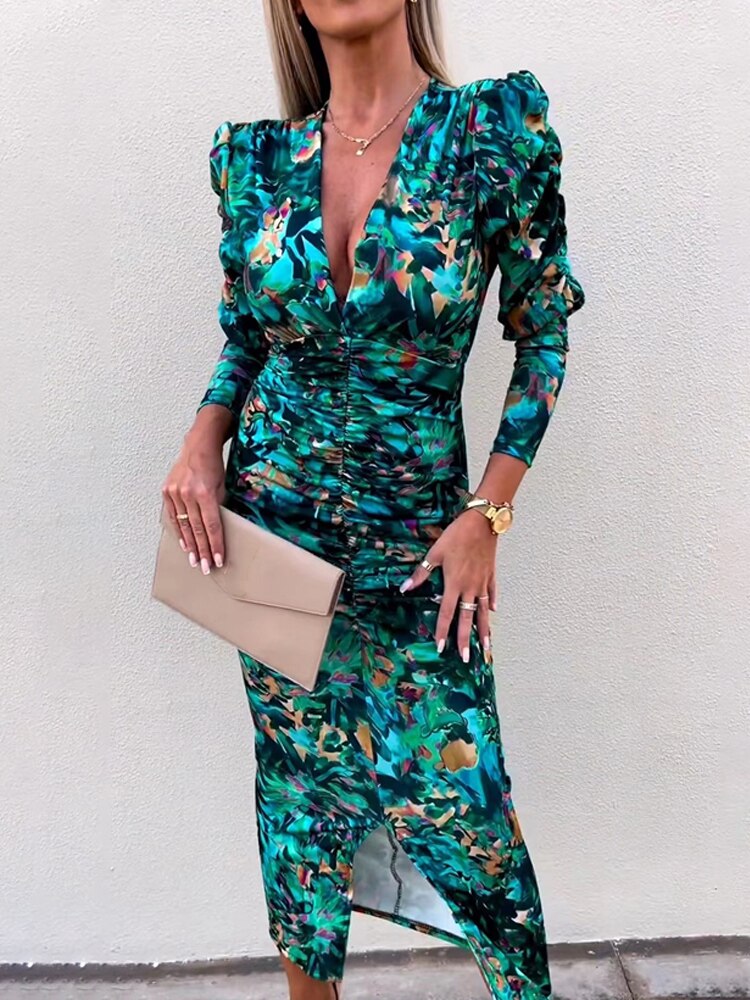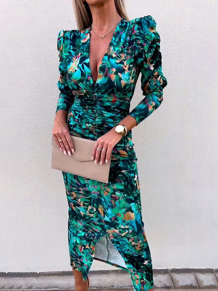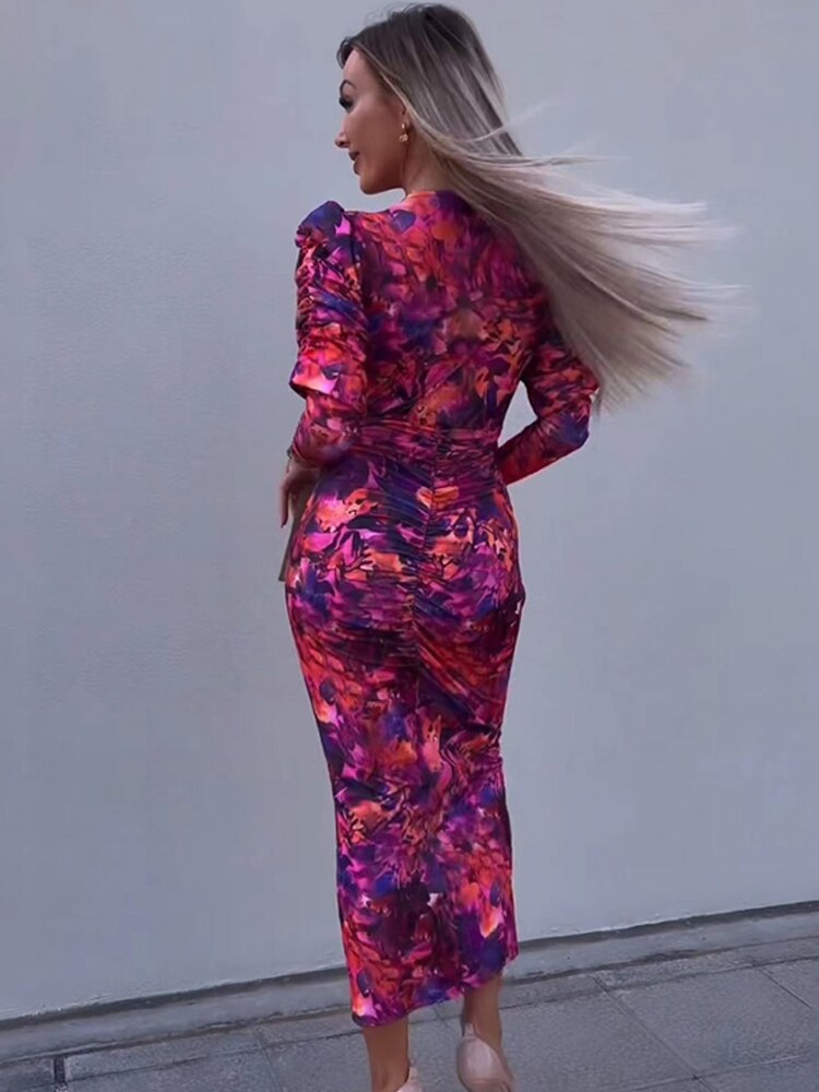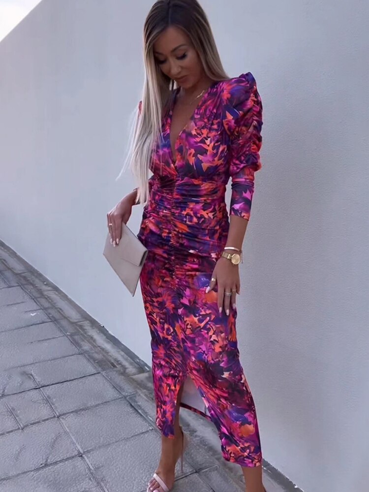 Women Luxury Party Dress Deep V-neck Puff Sleeve Printed Floral Bodycon y2k Vintage Split Eleastic Female Summer Prom Dresses