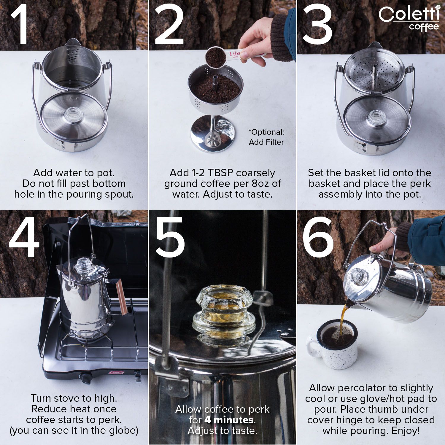 Do you like your coffee hot? The boiling water and convection process ensures the hottest coffee possible. The percolator coffee pot helps keep the coffee hot until you drink it. Our coffee percolator can brew up to 12 cups on a stove or grill.