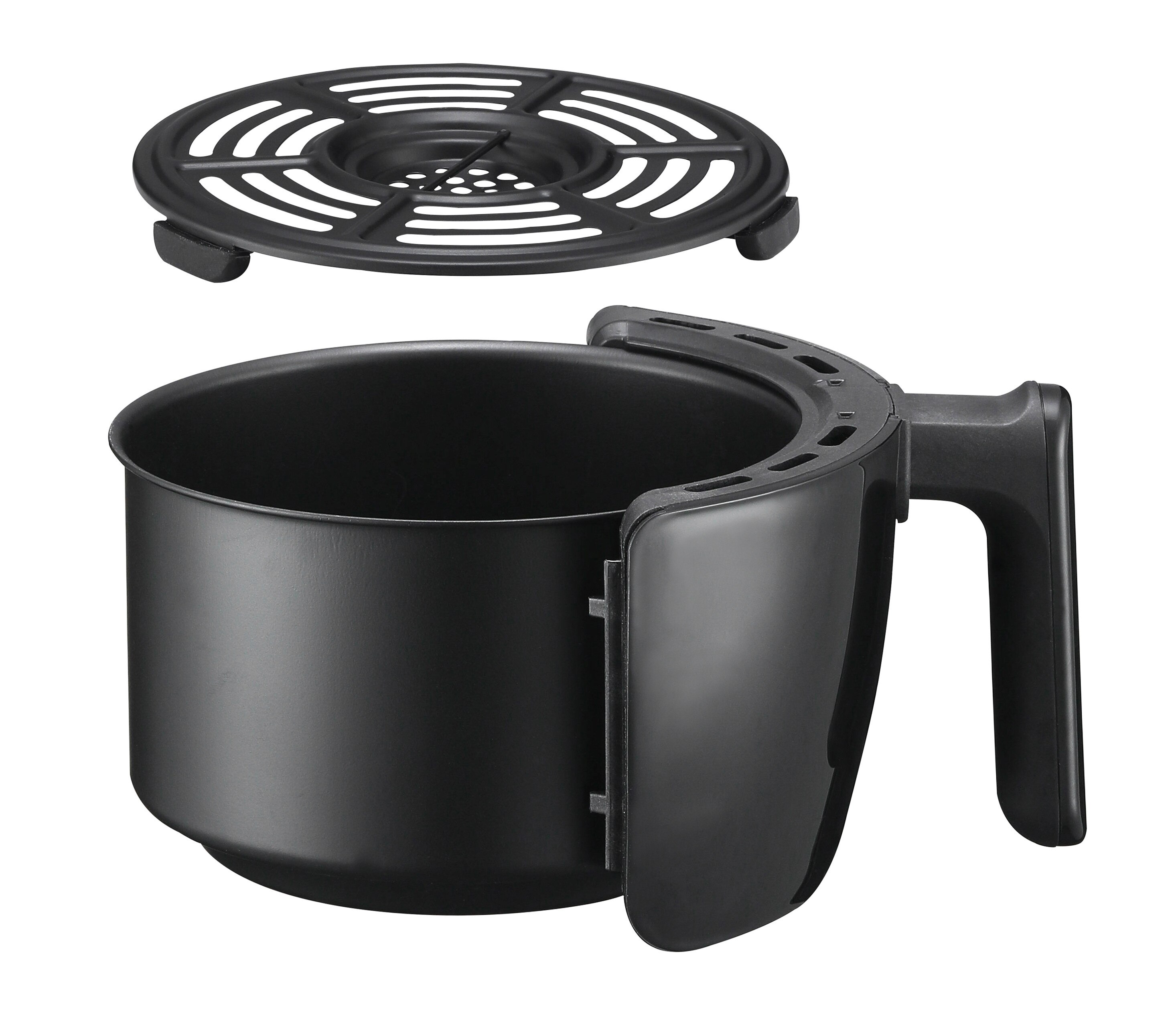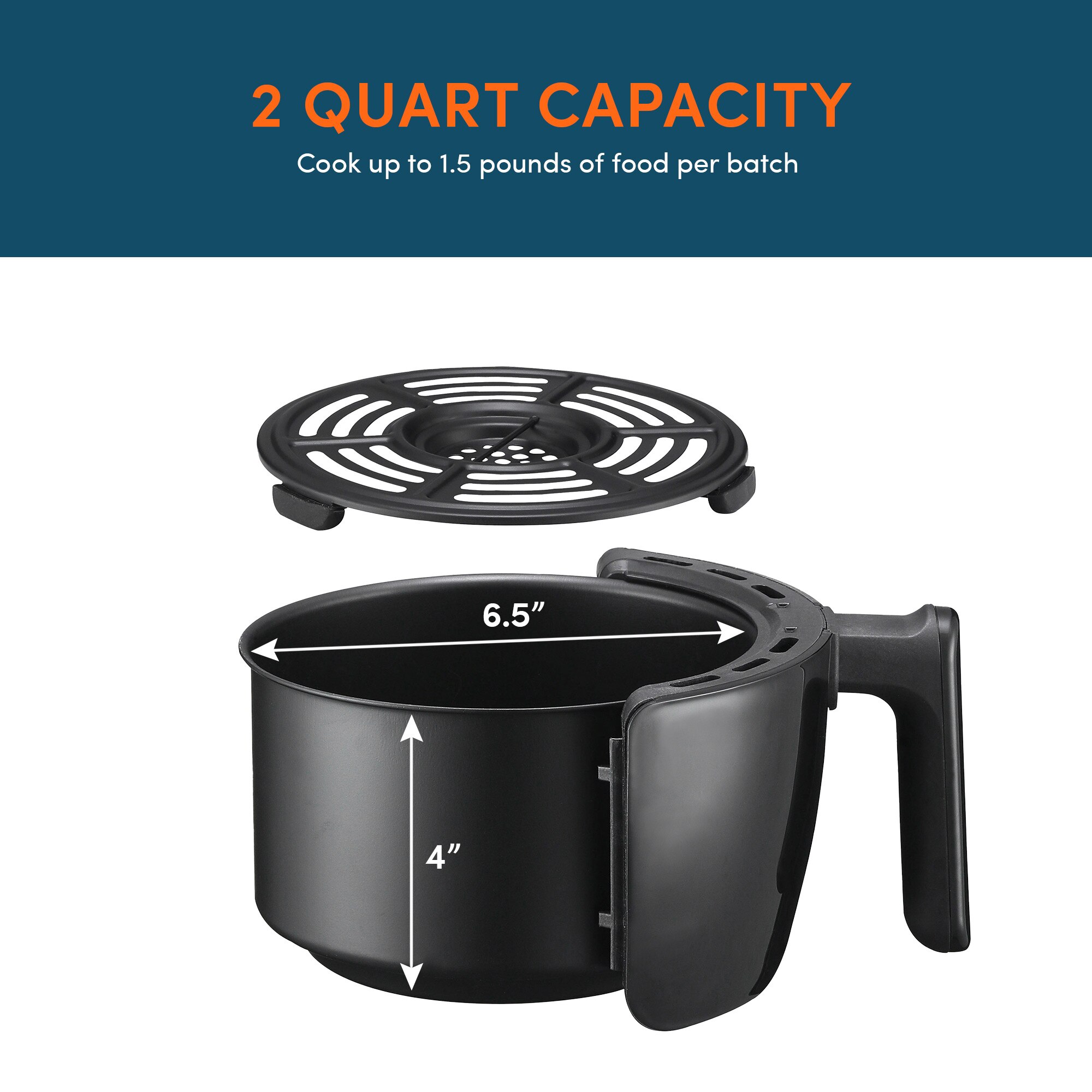 The 2Qt. Air Fryer has a variety of functions to handle a wide array of cooking tasks. With its easy to use temp/time controls, you can fry, cook, or even bake your favorite meals and snacks with ease! Not only can you cook foods without the mess of oil but you can cook faster which saves you time and energy. Unlike most conventional deep fryers, the air fryer`s unique vapor system combined with circulating hot air will automatically make foods crispier and of course healthier without oil. COMPACT SIZE: The PFOA/PTFE free non-stick pan and rack hold 2Qt or up to 1.4Lb of food perfect for personal use or when cooking for a few. Cook faster and more safely than in oil, eliminating splatter burns and reducing electricity use. HEALTHY EATING by cooking with 85% less oil for fat-free delicious meals. Same flavor and crispy finish without the added calories! Simply add food to the drawer pan, add a tbsp. of oil if desired, set temp/time, and start cooking! ADJUSTABLE TIME/TEMP gives you the ultimate in cooking control and versatility allowing you to fry, bake, grill and roast all in one! A high-power convection fan envelopes food in temperatures from 180 to 400F degrees and a 60-minute timer automatically shuts off the Air Fryer at the end of the cooking cycle. GUILT-FREE FRYING lets you enjoy crispy veggie chips, fish fillets, chicken tenders and more without fatty oils. Includes delicious and healthy recipes to get you started. COOL-TOUCH HANDLE lets you safely remove fried foods from the air fryer without burning your hands. The exterior of the Air Fryer retains its pristine condition with just a damp cloth. ETL APPROVED 1000-watt/120V air fryer with 2 quart capacity is ideal for home kitchen use. Dishwasher safe removable PFOA/PTFE Free non-stick coated 2 quart drawer pan with removable frying rack for fast, easy clean-up.