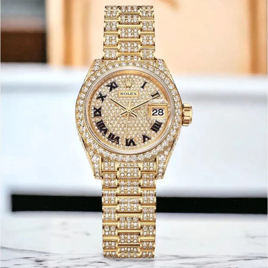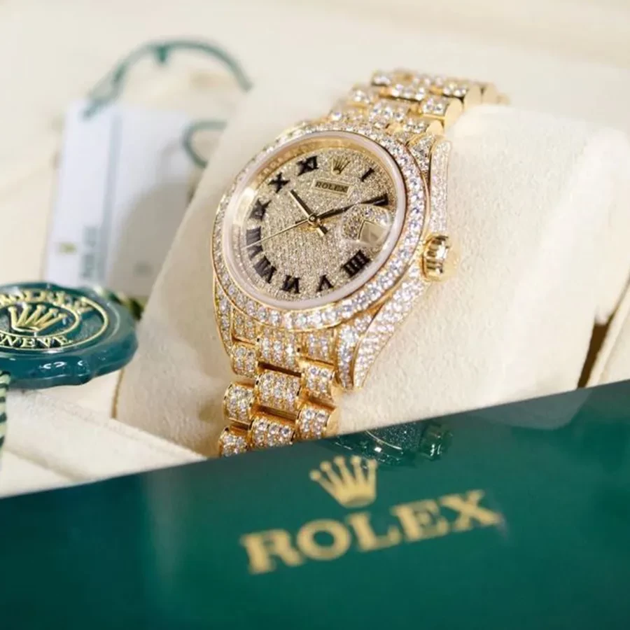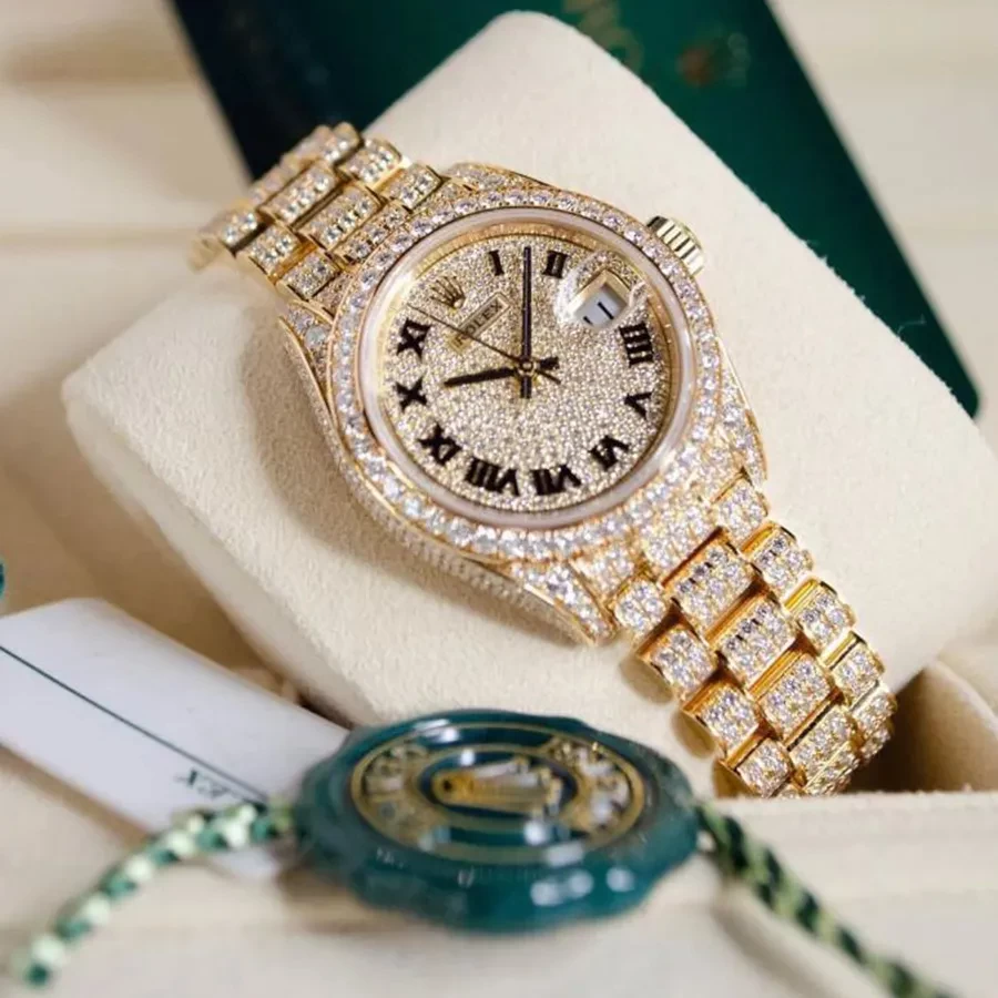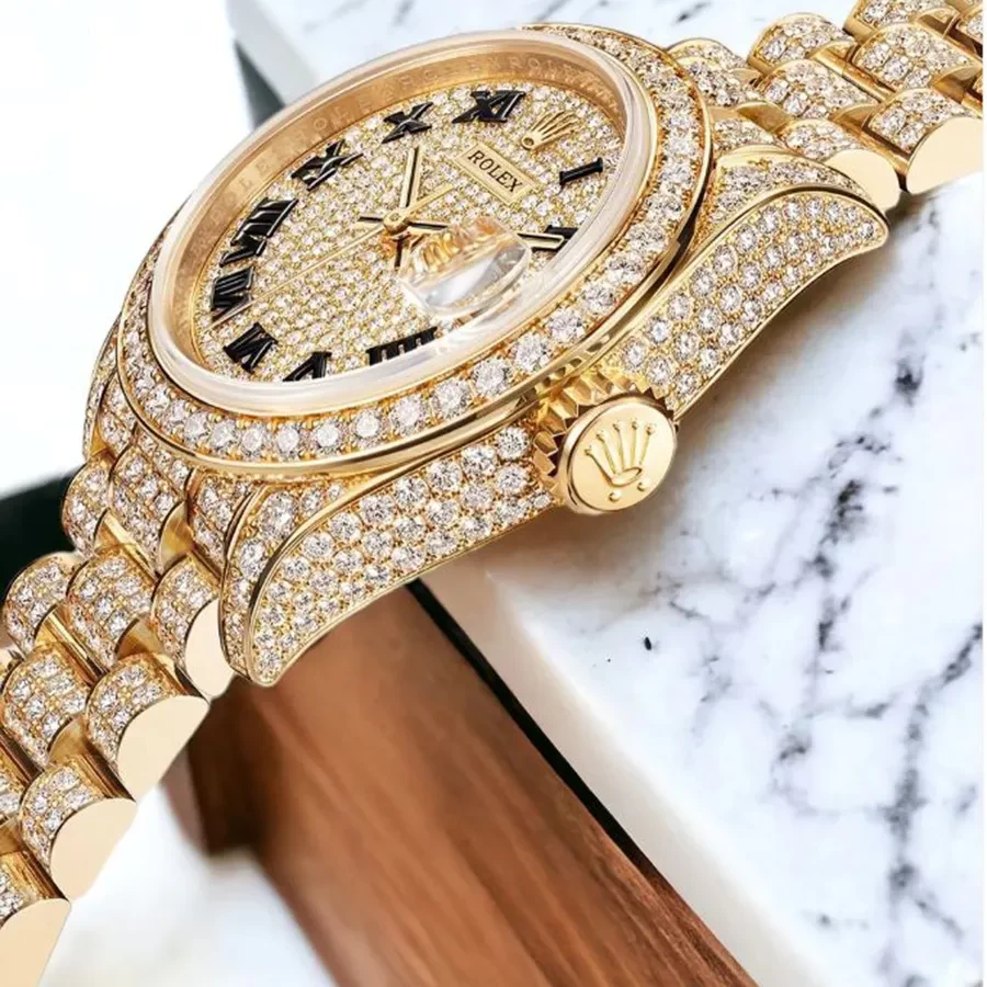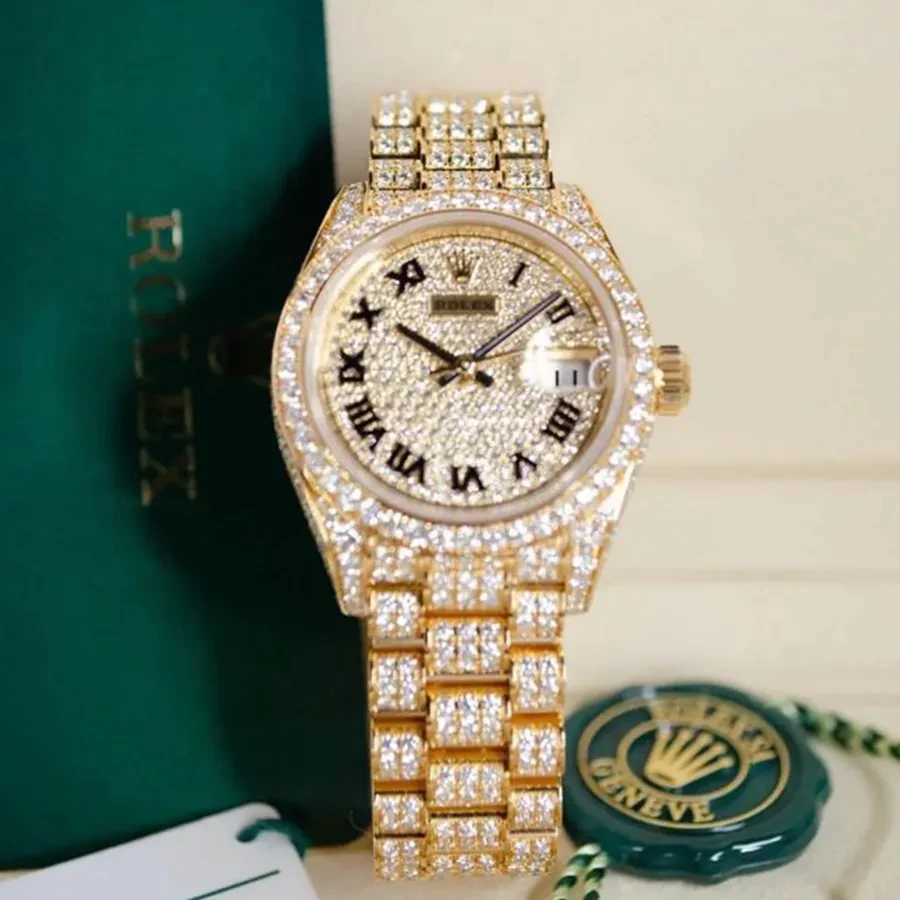 Mỗi một vị trí đều được tính toán cẩn thận, khảm nạm kim cương đối xứng một cách hoàn hảo. Ta có thể thấy các phần càng nối dây được làm chính xác tuyệt đối, không bao giờ có chuyện “thò thụt” như các phiên bản “lên kim”. Riêng với vành bezel, Rolex sử dụng những viên đá có kích thước lớn hơn, làm nổi bật chi tiết này trên bộ vỏ.