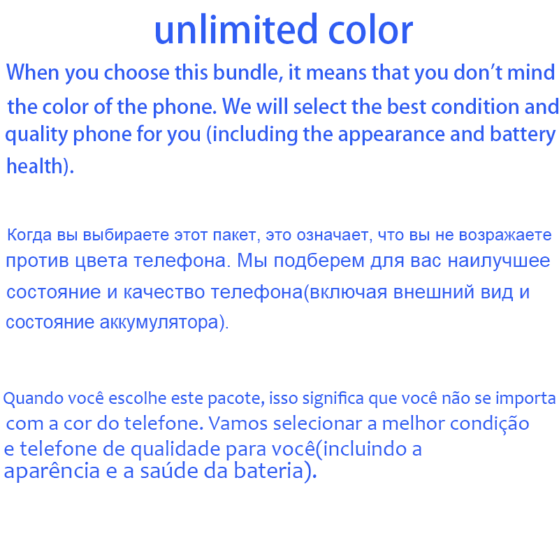 "Unlimited Color" :   it means that you don't mind the color of the phone. We will select the best condition and quality  phone for you (including the appearance and battery health).We will not send red,pink phone to male customers unless your agreed.