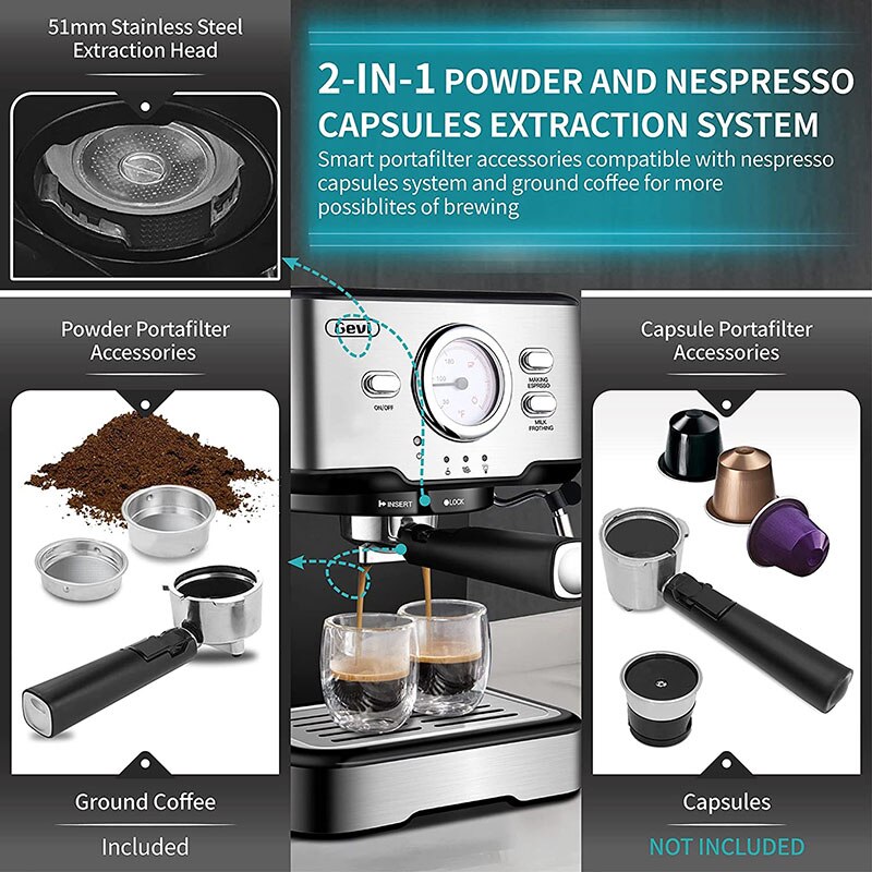 Gevi Espresso Machine 15Bar Coffee Machine Semi-automatic Household Coffee Maker with Foaming Milk Frother Wand 1100W GECME403-U