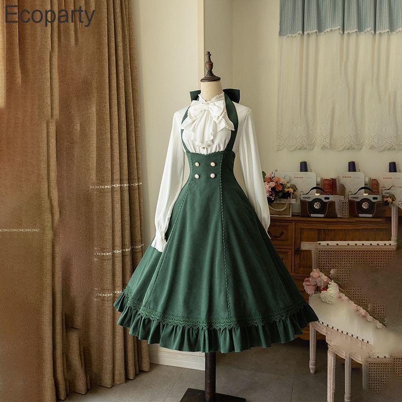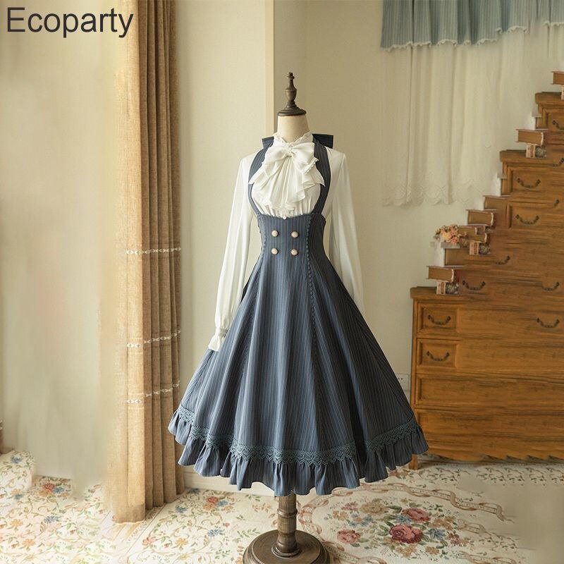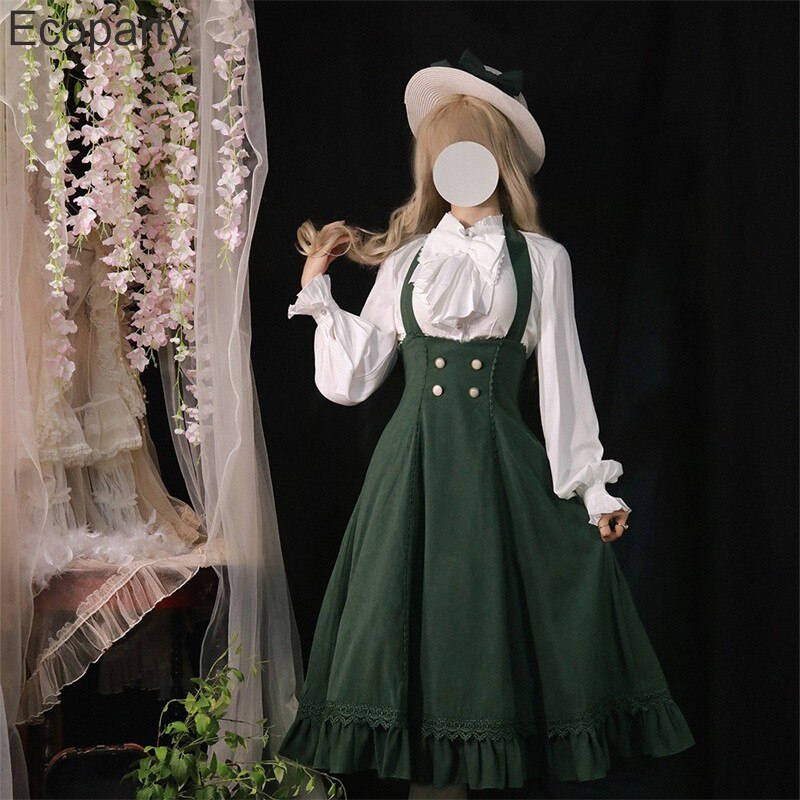 Women Sweet Vintage Suspender Dress Victorian Lolita A-Line Dress With Bowknot Long Sleeve Shirt Suit Girls Elegant 2pcs Dresses