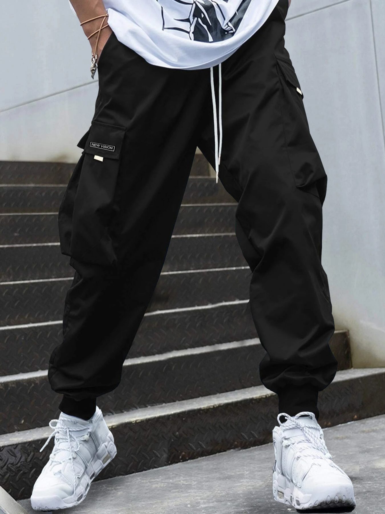 Men Letter Graphic Flap Pocket Drawstring Waist Cargo Pants