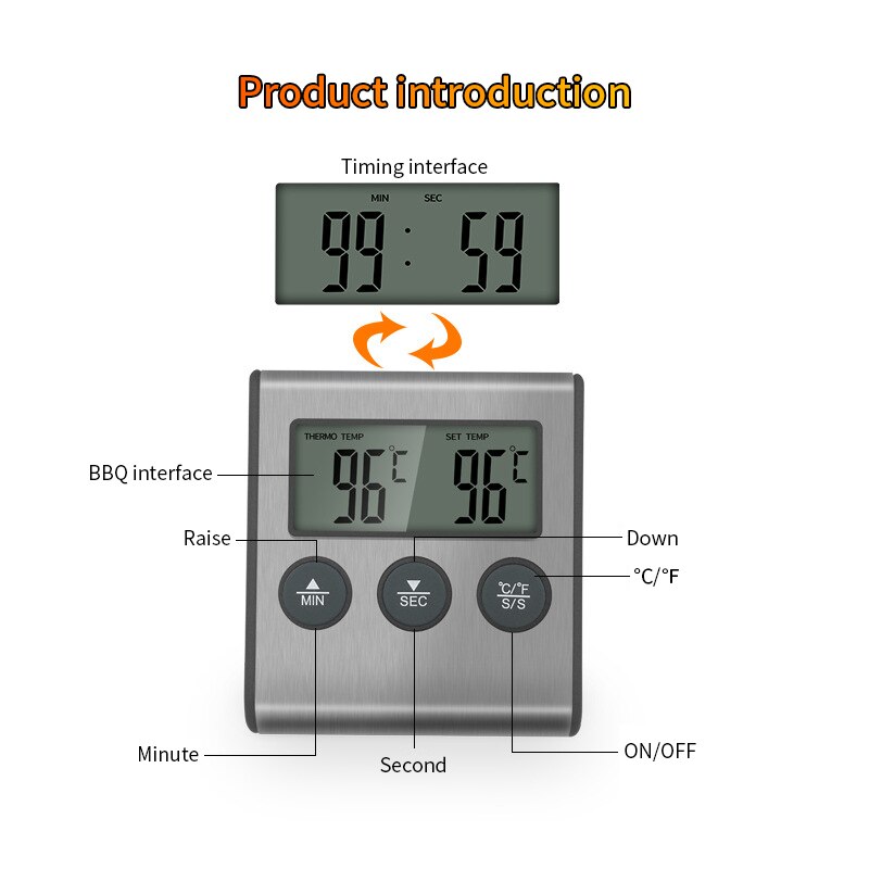 Mini Kitchen Digital Cooking Thermometer Meat Food Temperature for Oven BBQ Grill Timer Function with Stainless Steel Probe