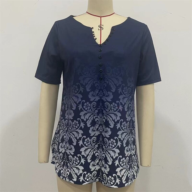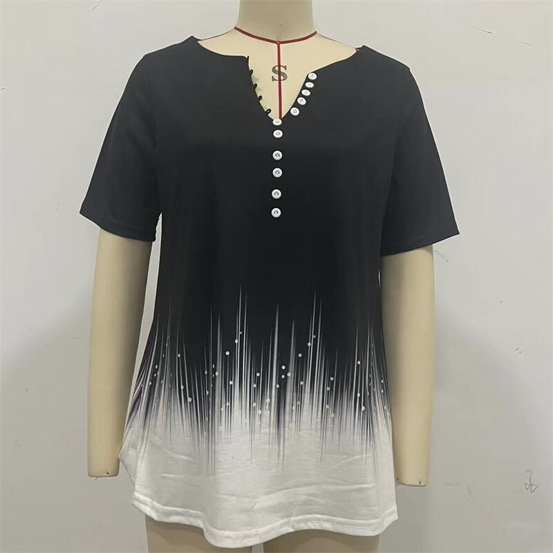 Summer Elegant Button Splicing V Neck T-Shirt Female Print Loose Short Sleeve Tops Women's Pullover Tees Daily Casual Streetwear