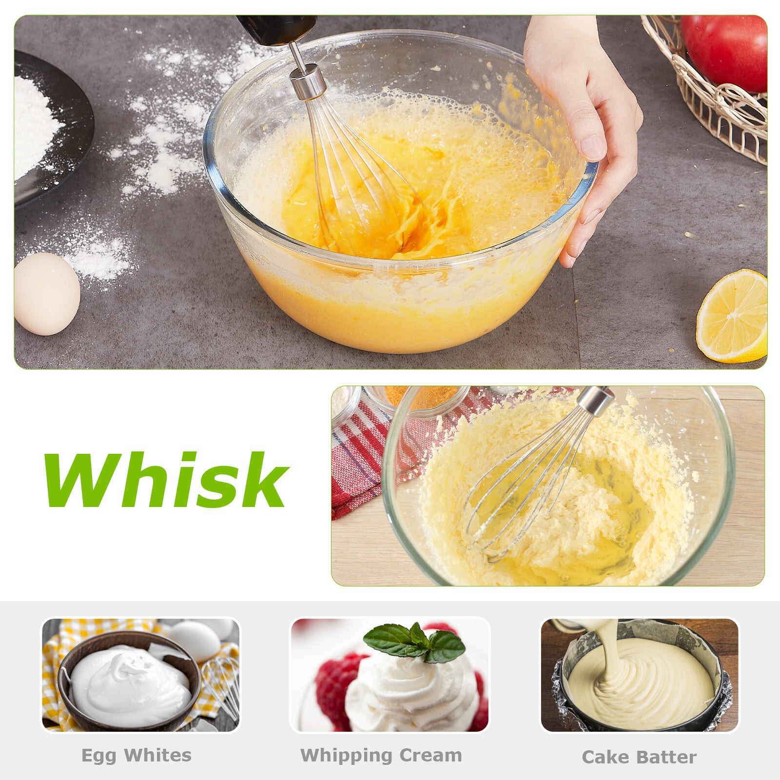 - 4-in-1 Ergonomic Immersion Hand Blender Including Hand Blender, 500ml chopper bowl, 700ml measuring cup, and egg whisk. Perfect for baby foods, soups, smoothies, ée, and more. Ergonomic handles support one-handed operation with ease and help you to make the food preparation process faster and easier.