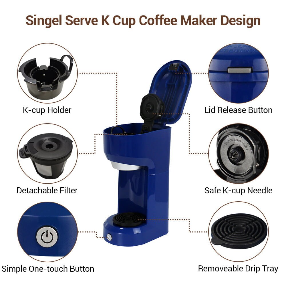Single Serve Coffee Maker 6-14OZ With Filter Coffee Brewer for K Cup Pods Capsule Ground Coffee Coffee Machine, Blue