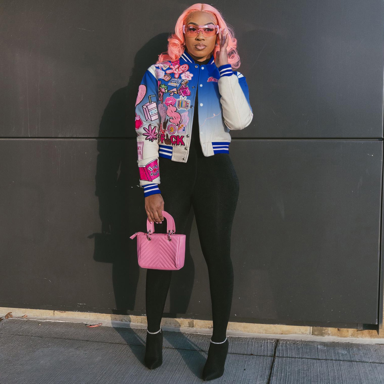 Women's Spring Casual Gradient Long Sleeve Coat Varsity Baseball Uniform Bomber Jacket Single Breasted Outdoor Streetwear