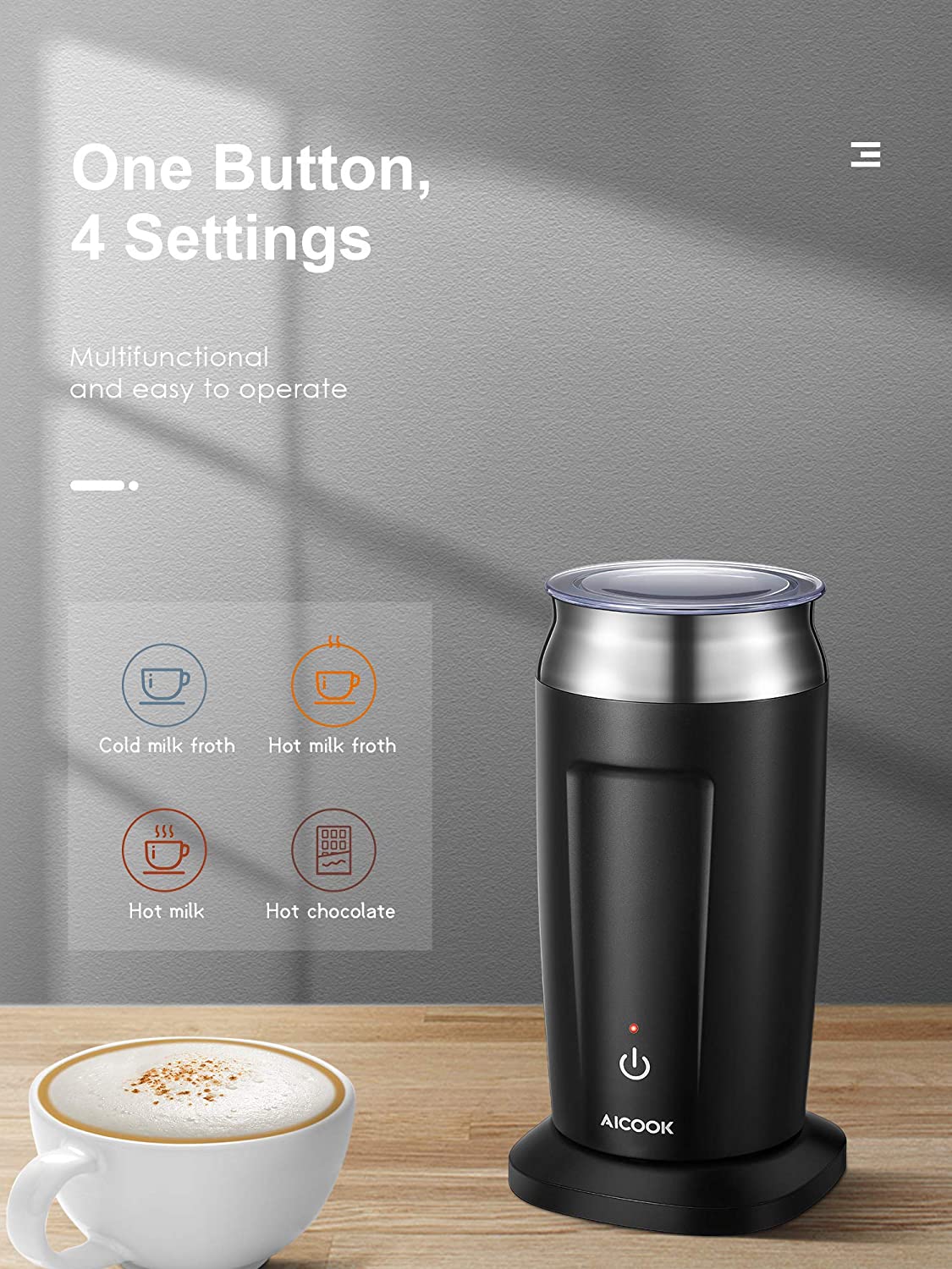 - Hot & Cold Dual Mode-This high-quality milk frother can make either hot or cold milk foam and can also heat milk, offering you a wide range of options for your next latte or cappuccino. You can customize foamed milk for different types of specialty coffees at the push of one button on the milk frother at home.(Note: It is recommended to use whole milk for better frothing effect)
