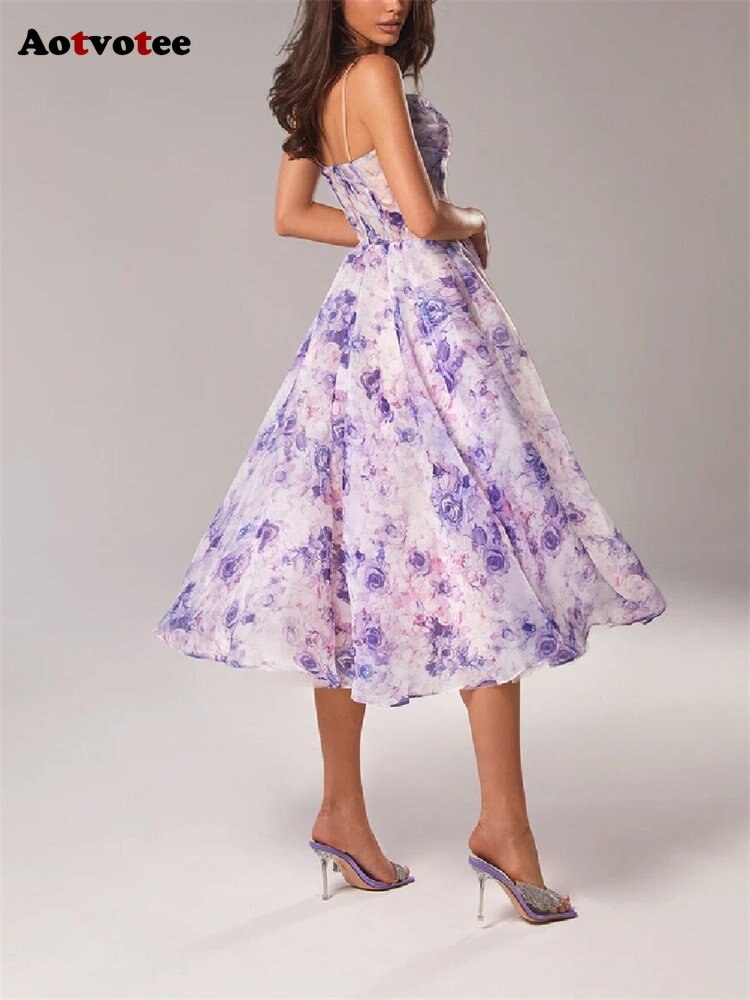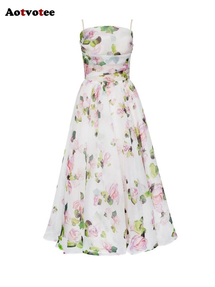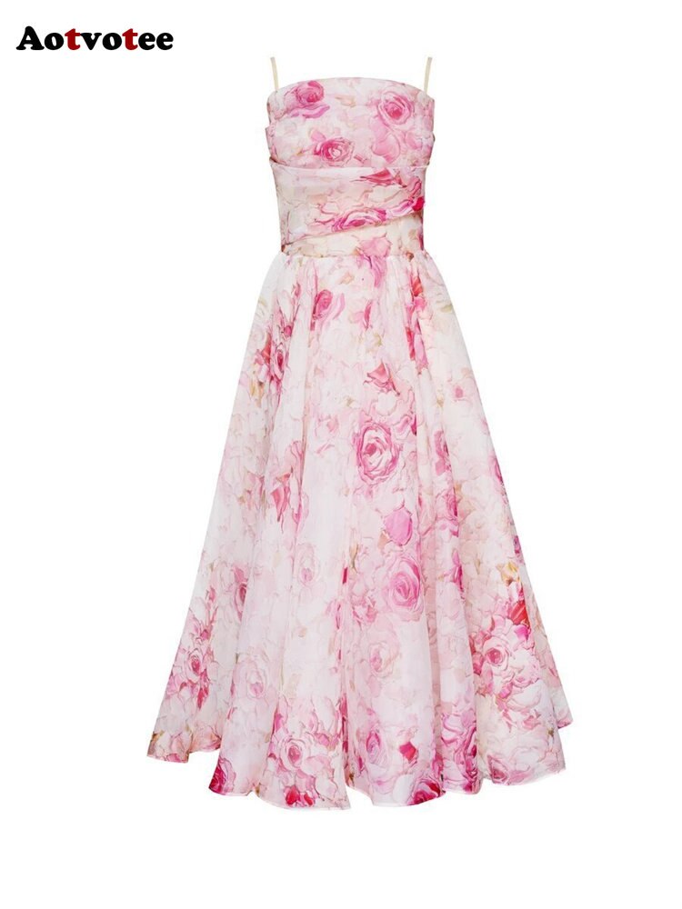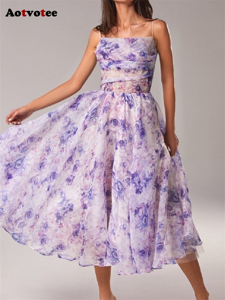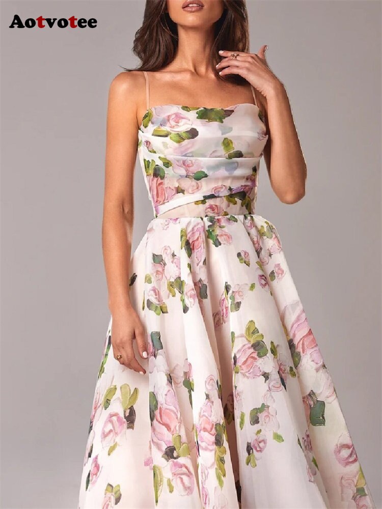 Aotvotee Spaghetti Strap Dress for Women 2023 Fashion Sweet Sleeveless Summer Dress Elegant Printing Fit and Flare Midi Dress