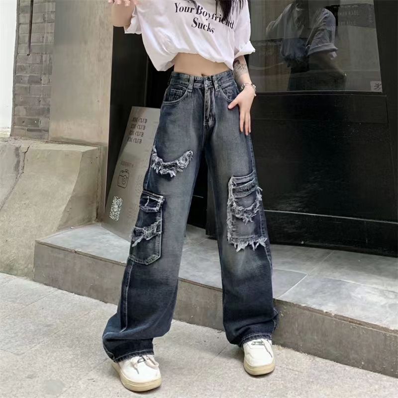 Design Feeling Raw Edge Jeans Women's Spring and Autumn 2023 New High Waist Straight Leg Jeans Loose Fit Wide Leg Pants Fashion