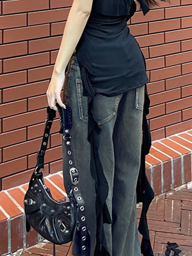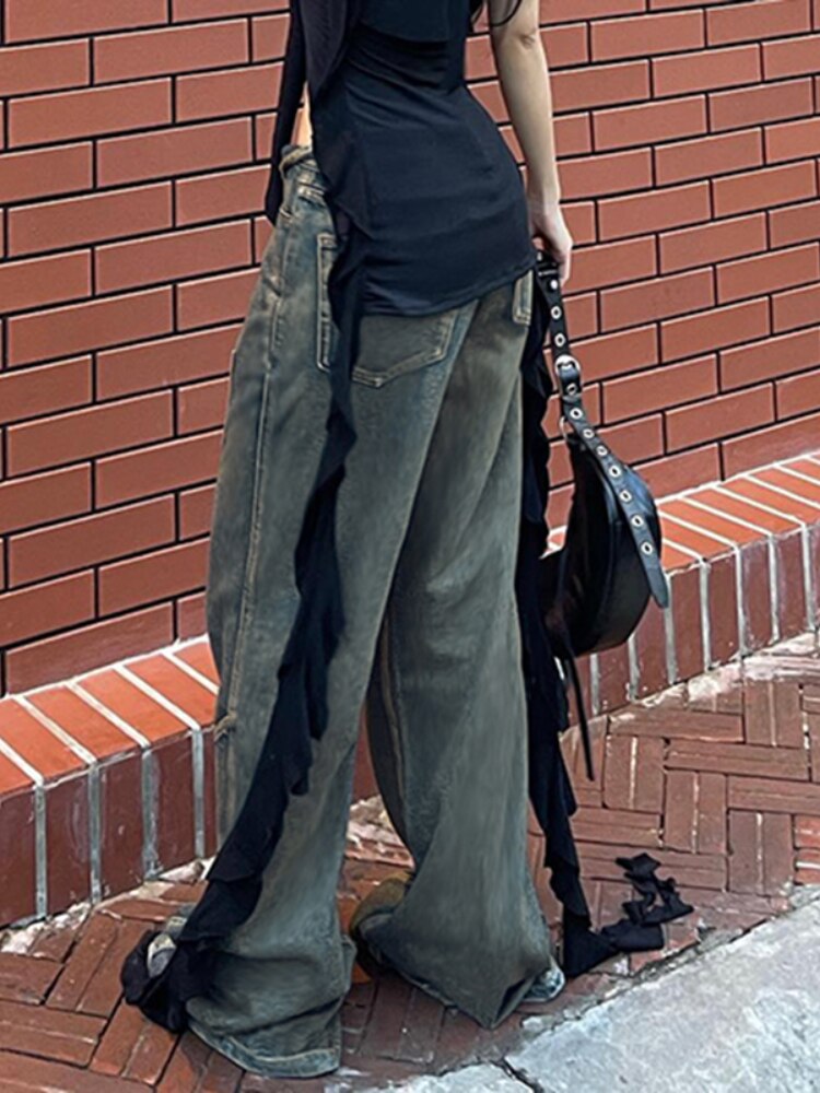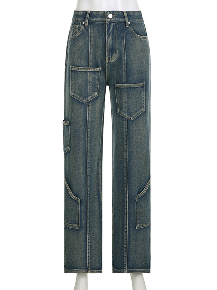 WeiYao Cargo Jeans Washed Vintage 90s Straight Leg Jean Trousers American Retro Pockets Women Low Rise Pants Korean Streetwear