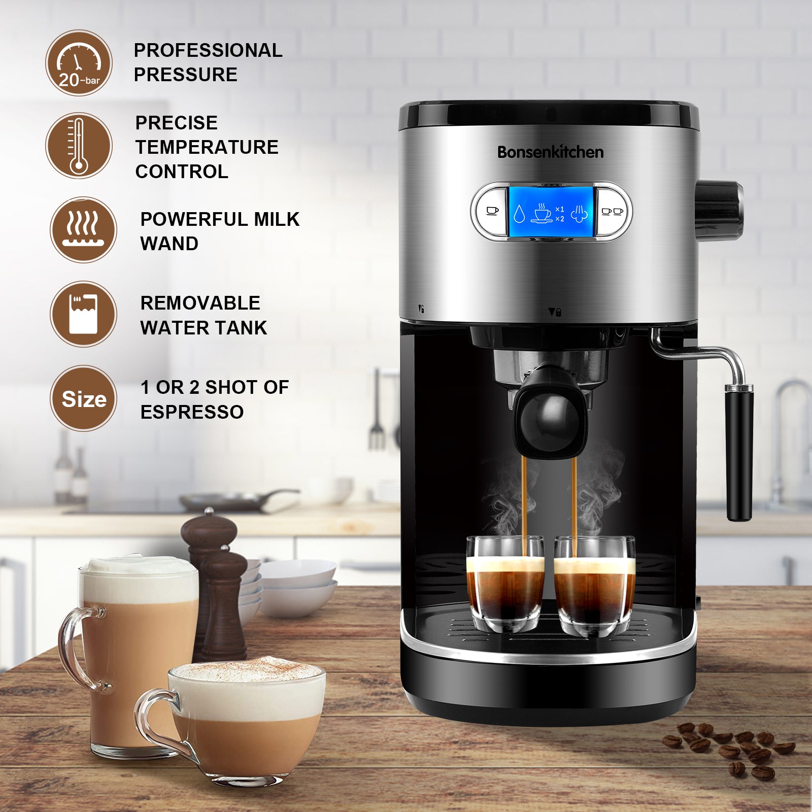 20-Bar Espresso machine This coffee machine with the foam stick for easy frothing milk. It has a sturdy stainless steel body that is wrapped in a stylish design and is the perfect addition to any kitchen. The coffee machine has two separate temperature control systems with which the water and steam pressure can be controlled separately.