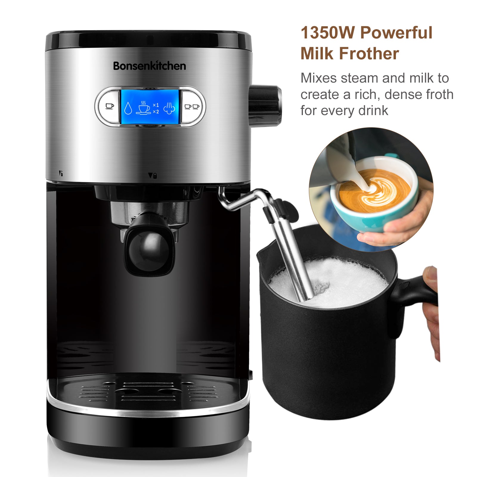 • ☕20 Bar Pressure for High Quality Extraction: This 1350W espresso machine has a 20 bar high pressure pump that creates an incomparably dense, creamy and luscious coffee extraction that maximizes the aroma of the coffee beans and the overall quality of the natural oils for maximum extraction of the espresso aroma.