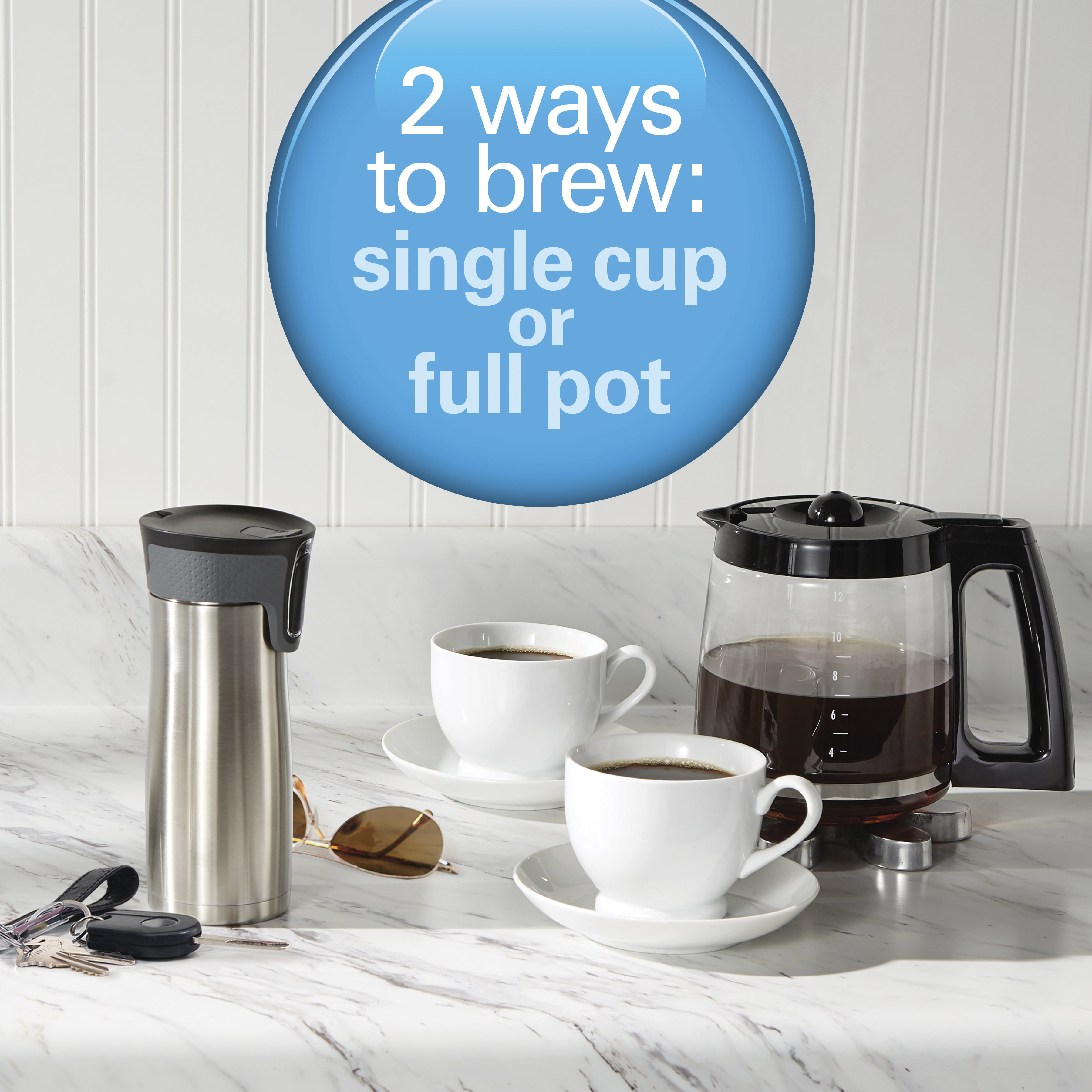 • 2 WAYS TO BREW: SINGLE CUP OR FULL POT. The included single-serve scoop makes it easy to just scoop, place and brew. You can brew up to 14 oz. into a cup or travel mug on the single-serving side or make up to 12 cups on the carafe side with ground coffee.